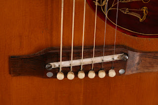 Hummingbirds were finished in the vibrant cherry sunburst finish as seen most famously on 1958-1960 Gibson Les Paul Standards. This guitar's finish has faded to a gorgeous muted shade that is less like a sunburst and more like a sunset. This guitar, a California resident for its' entire life, probably saw massive sun exposure at folk festivals and love-ins.
